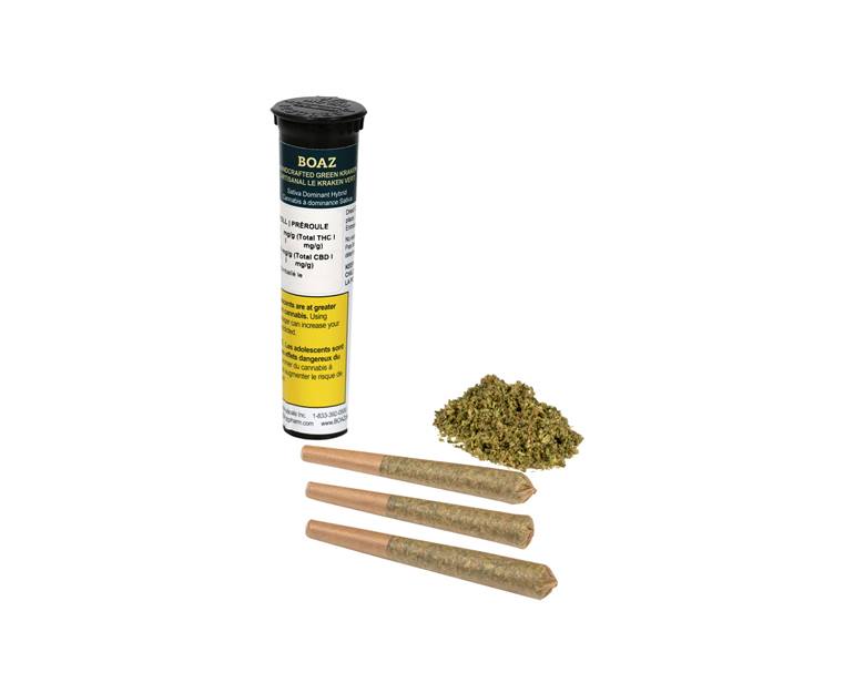 BOAZ Craft Cannabis premium flower pre-rolls are always made with full buds. Each pre-roll is crafted by hand through being filled, rolled and even packaged. Green Kraken is a legendary sativa-dominant hybrid strain. These buds are dense, dark green, with a sharp compact structure. Green Kraken releases a high amount of THC and smells of unique aromas. The terpene profile is dominated by myrcene followed by caryophyllene and humulene.