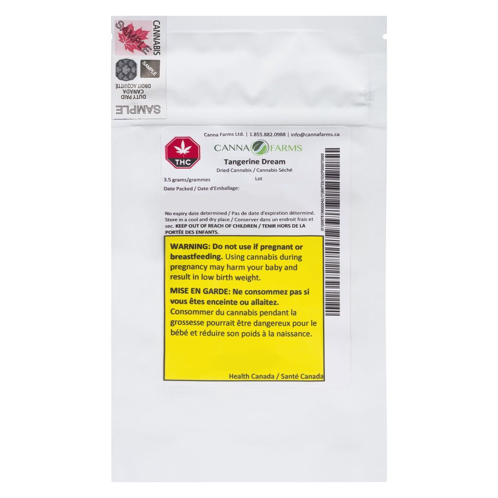 Tangerine Dream from Canna Farms is a hybrid strain with very strong THC potency. It's a combination of G13 and Neville's A5 Haze, with a citrusy fruit smell created by the myrcene, beta- and trans-caryophyllene, limonene and guaiol combination in its terpene profile. It's grown indoors in B.C. and available as a 1 g pre-roll and a 3.5 g package of dried flower.