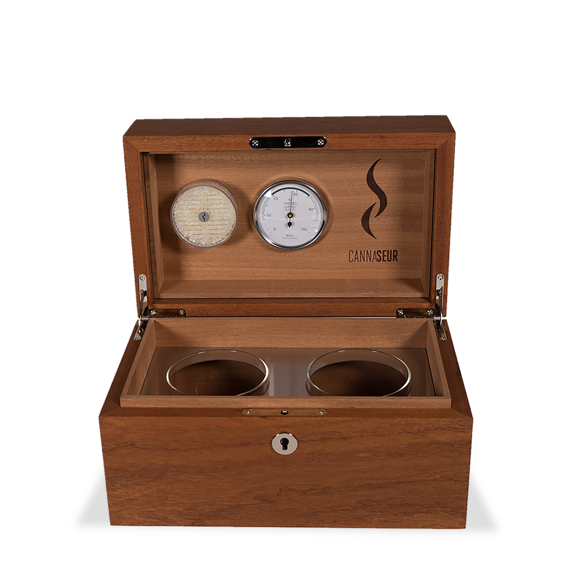 This product is final sale. Cannaseur's mahogany humidors are made from sustainably sourced solid wood and feature a German-made precision hygrometer for measuring humidity levels. There are two models available a Two Jar configuration that can store 2 oz of cannabis, and a One Jar option that stores up to 1 oz of cannabis and includes an equipment box with lid. The patented Micropore Core technology inside the humidor keeps dried flower at the ideal humidity. The humidor is lockable, is available in mahogany and measures 11" x 6.7" x 6.5".
