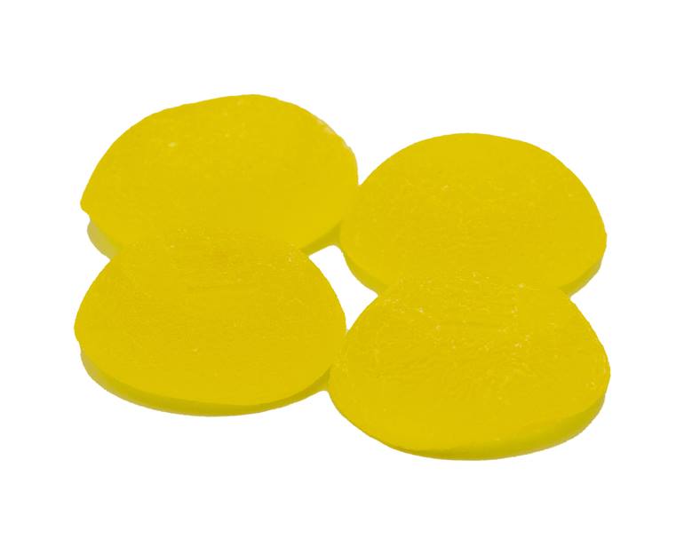 Each dome-shaped, flavoured Chowie Wowie Mango Pineapple Chew contains 2.5 mg of THC and CBD per gummy. Four per package.
