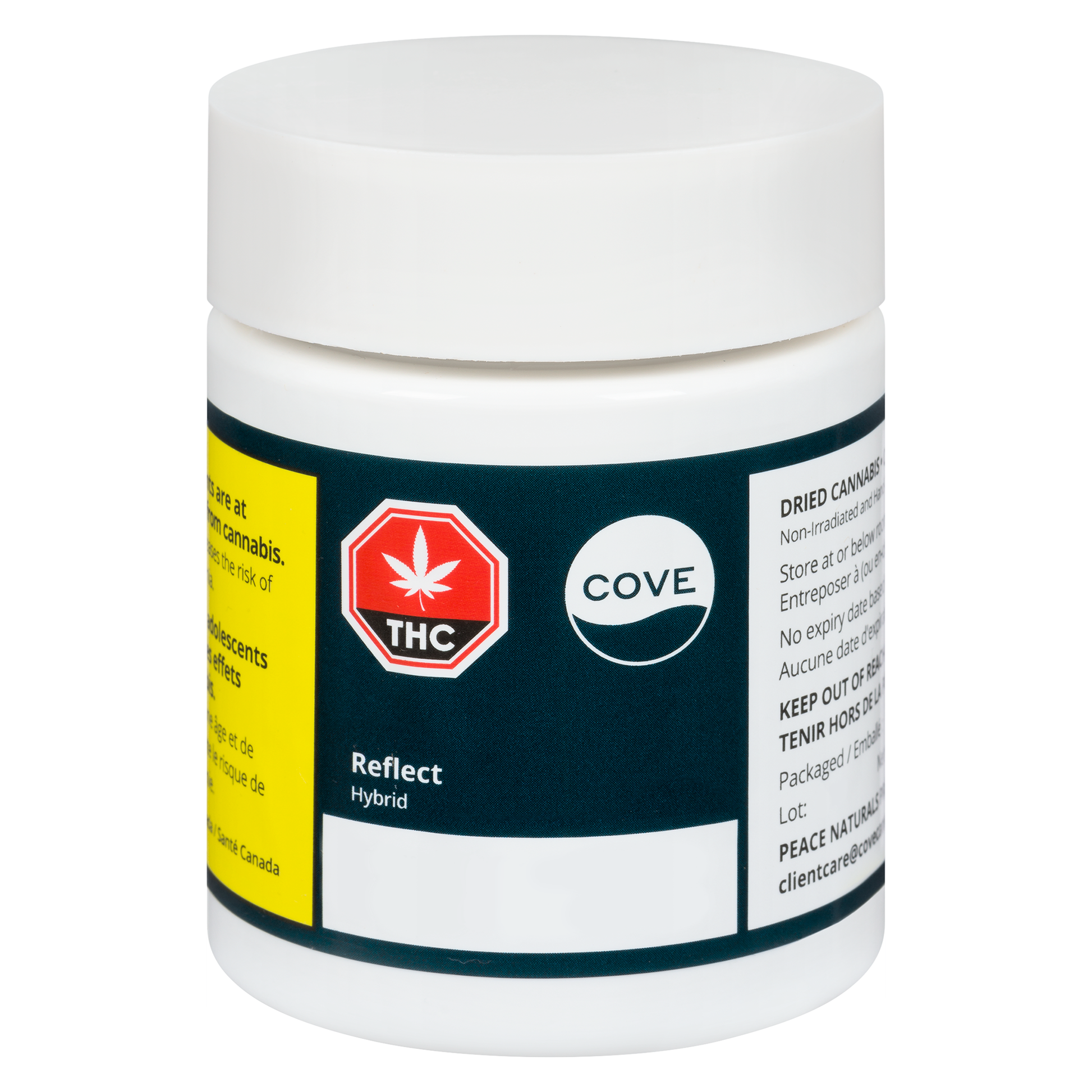 Cove's Reflect is an indoor-grown hybrid strain with very strong THC potency. Its white and green buds are hand-trimmed and non-irradiated, and its aroma is earthy, woodsy, piney and peppery, thanks to the myrcene, alpha-pinene and beta-caryophyllene in its terpene profile. It's available in pre-rolls and three dried flower sizes (1 g, 3.5 g and 7 g).