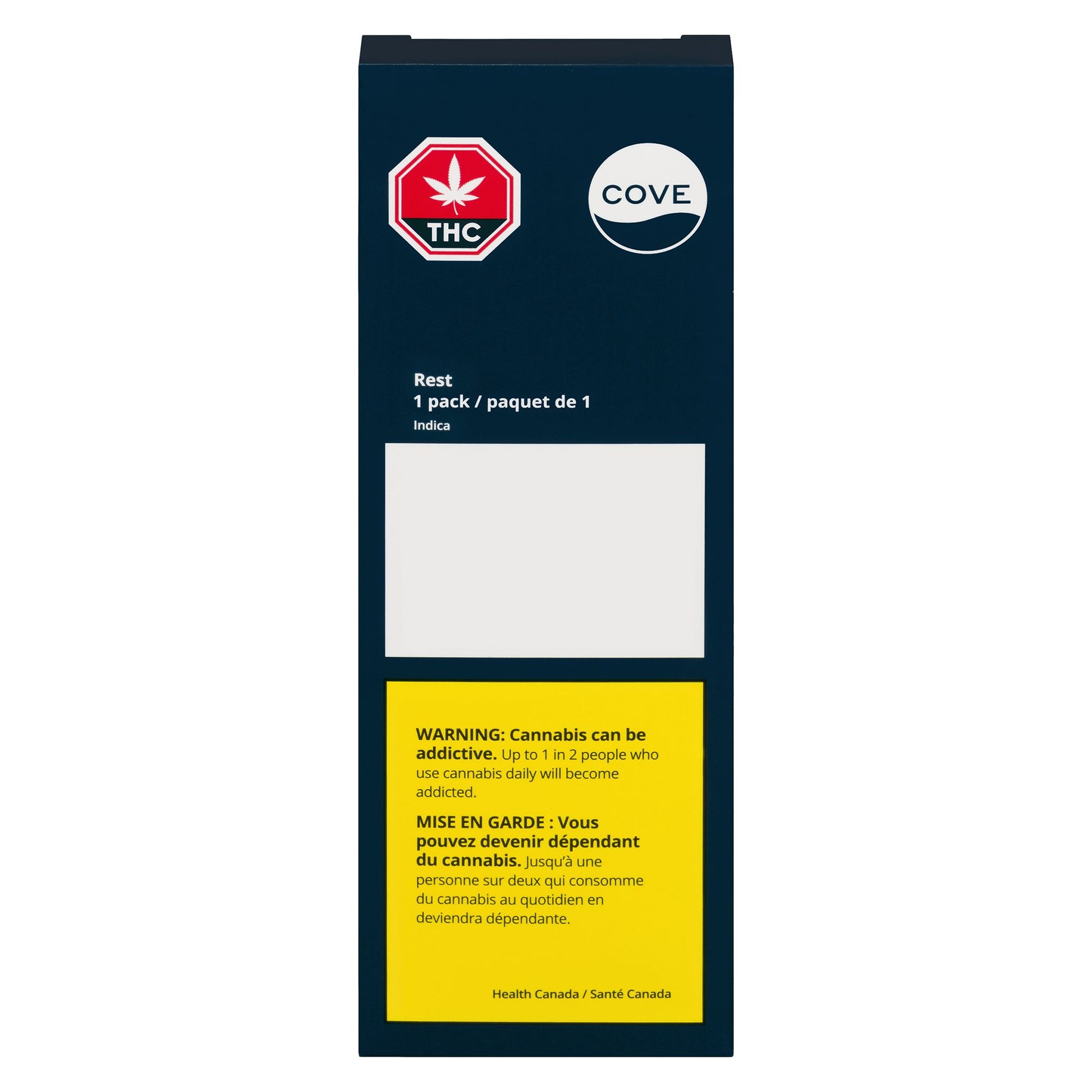 Rest from Cove is an indoor-grown indica-dominant strain with strong THC potency. Its pink and green buds are hand-trimmed and non-irradiated, and its terpene profile, featuring limonene and linalool, returns a mix of citrusy, earthy and vanilla flavours. It's available in three dried flower sizes and pre-rolls.