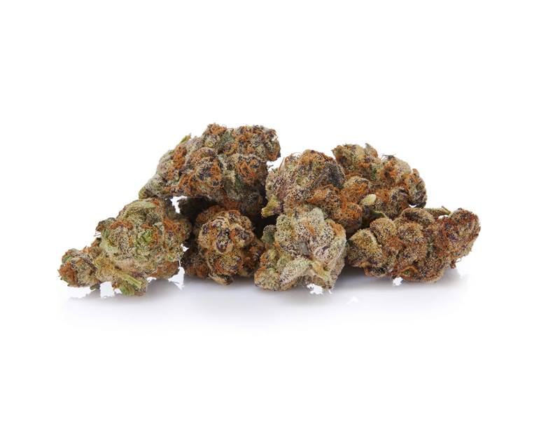 Lava Cake's medium-sized, firm buds are covered in frosty trichomes with hues of purple and bright green, accented with light brown pistils. Before grind, the aroma is sweet and savory from the presence of caryophyllene. After grind, the aroma is relatively unchanged.