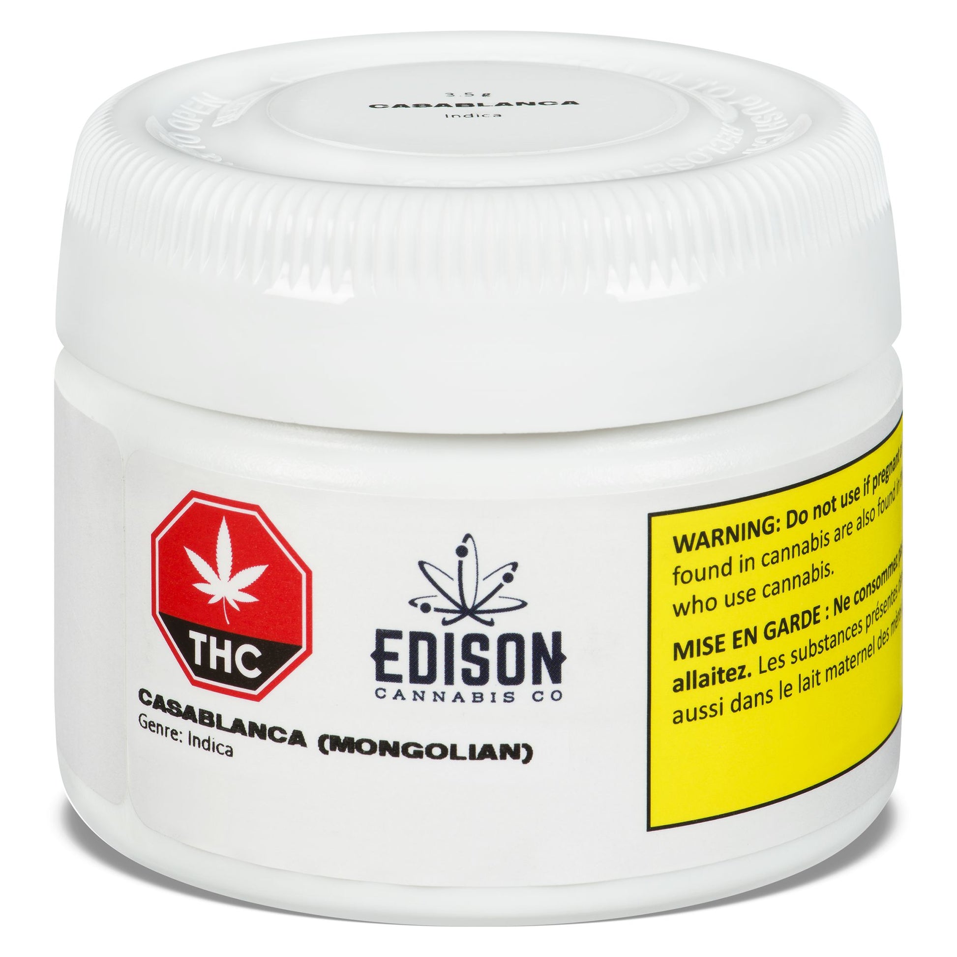Indica-dominant Casablanca from Edison is a bold indoor-grown and machine-trimmed strain featuring plush, rich forest green flowers with hints of orange, tightly woven buds and an earthy, fresh aroma from the alpha-pinene and myrcene in its terpene mix. It has strong THC potency and is available in four dried flower weights 1 g, 3.5 g, 7 g and 15 g. All Organigram products are individually packaged with Integra Boost technology, which preserves freshness and controls relative humidity levels, therefore extending the products' shelf life.