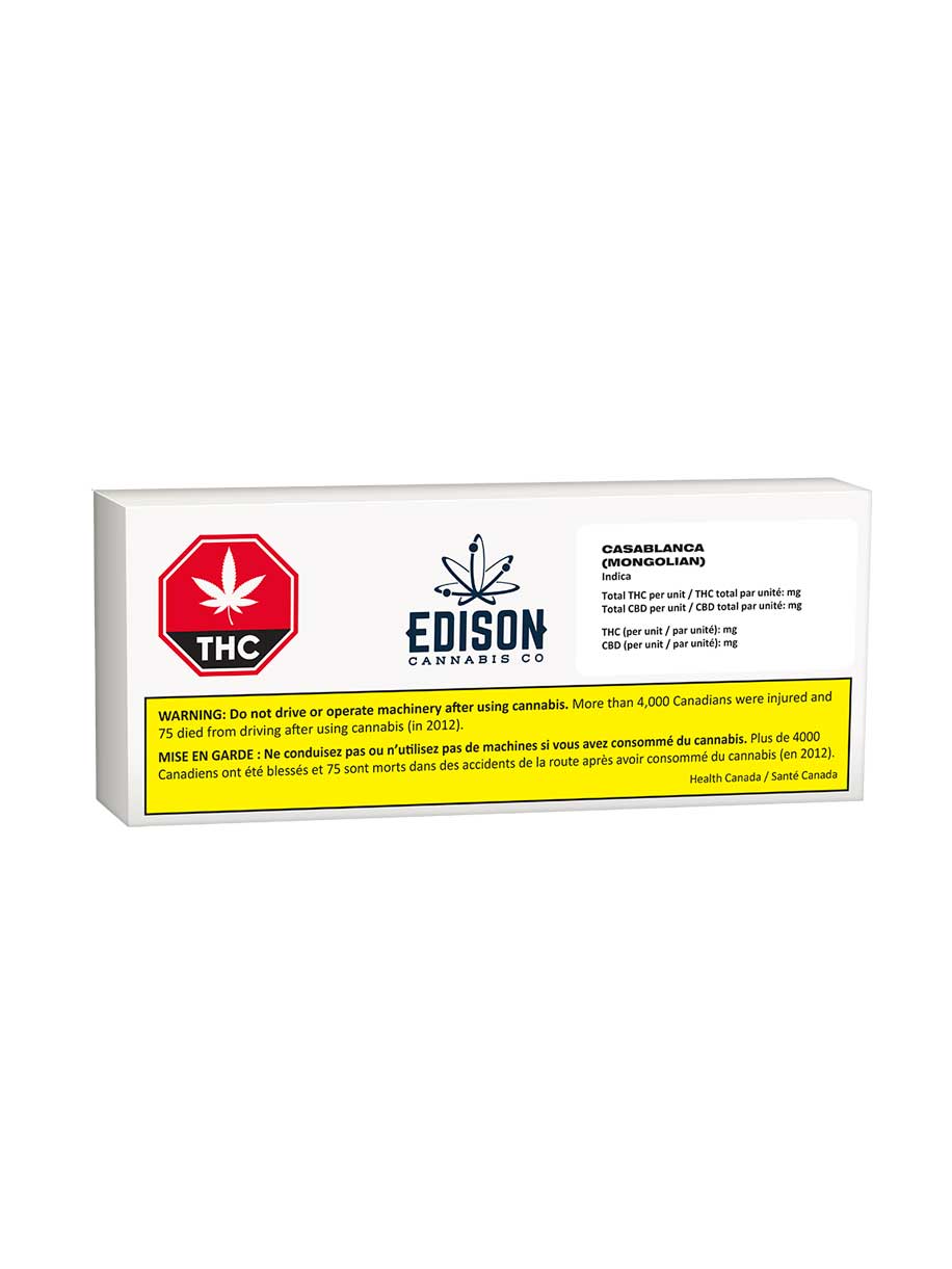 Indica-dominant Casablanca from Edison is a bold indoor-grown and machine-trimmed strain featuring plush, rich forest green flowers with hints of orange, tightly woven buds and an earthy, fresh aroma from the alpha-pinene and myrcene in its terpene mix. It has strong THC potency and is available in four dried flower weights 1 g, 3.5 g, 7 g and 15 g.
