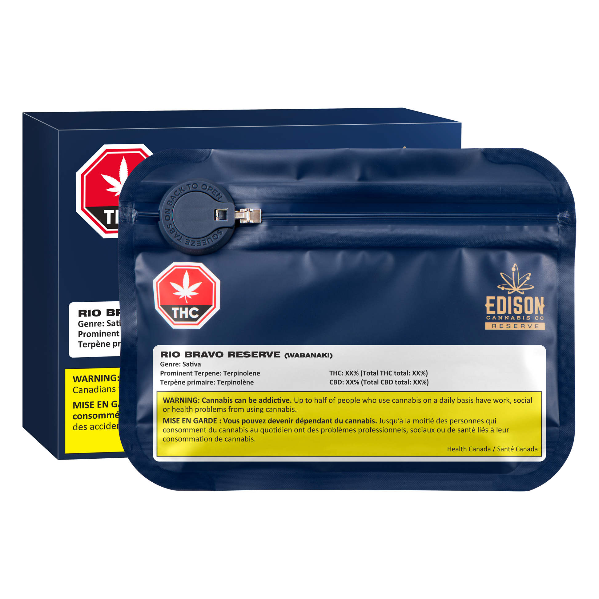 Sativa-dominant Rio Bravo Reserve from Edison is an indoor-grown hand-trimmed and craft-cured strain. It features compact flowers laced with bright crimson pistils and woodsy, spicy, sweet aromas from the terpinolene and myrcene in its terpene mix. It has very strong THC potency and is available as 7 g of dried flower.