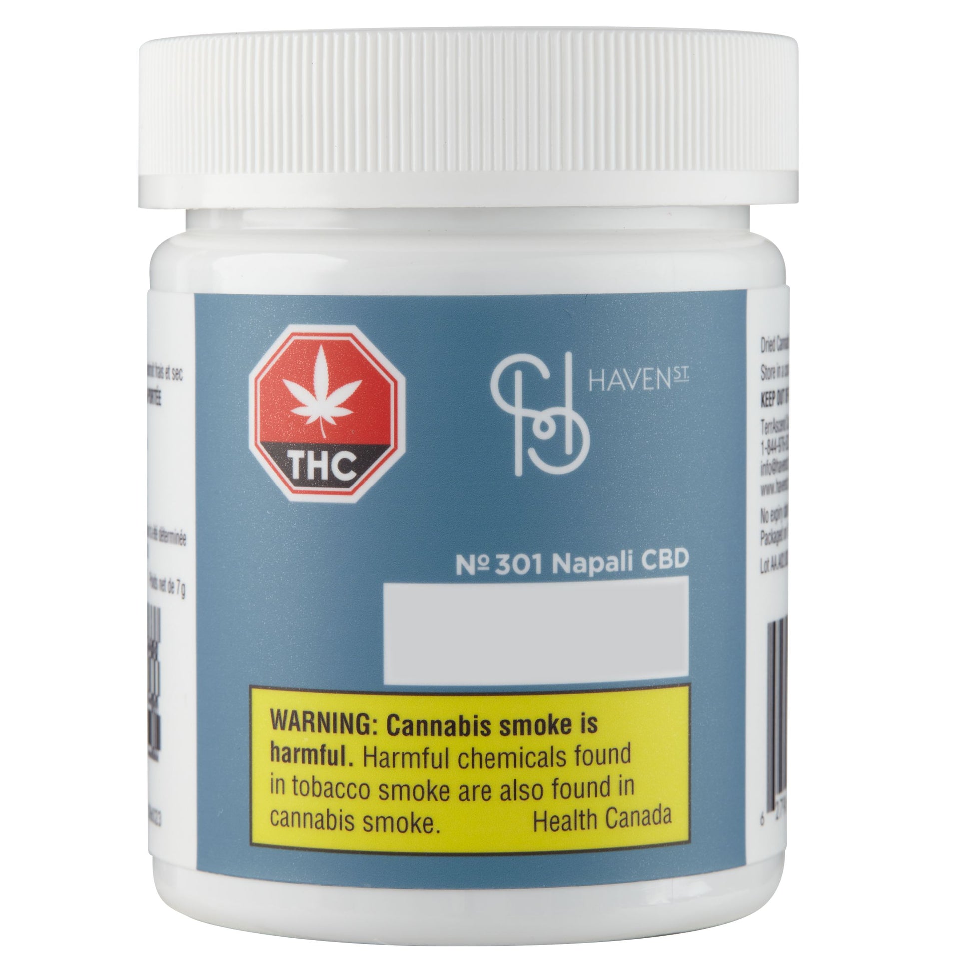 Haven St. grows and harvests No. 301 Napali CBD indoors as an irradiated whole flower, then hand-trims and hang-dries the green and yellow buds. The alpha-pinene and limonene in its terpene profile give it its sweet, citrusy flavour and fresh herb notes. Napali has a CBD to THC ratio of 2 1 which caters to those who are looking for a CBD-dominant strain with mild THC potency. Available in a variety of dried flower and pre-rolled formats.