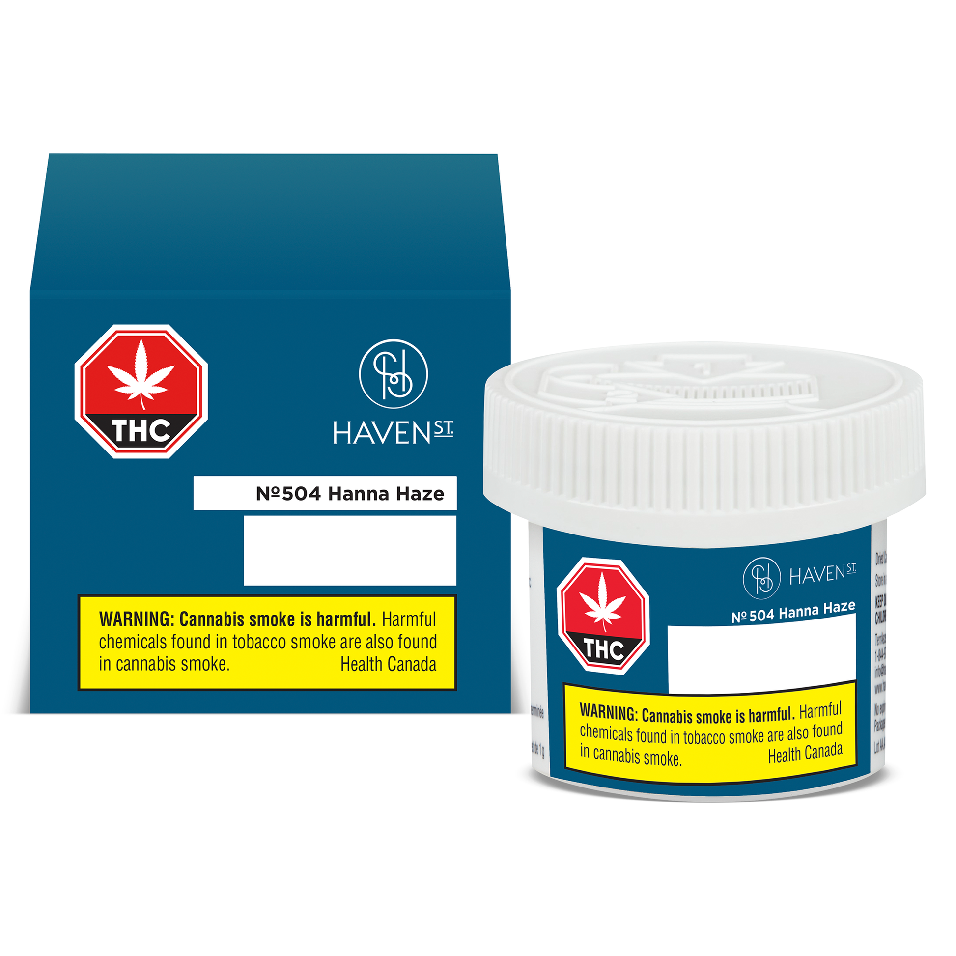 No. 504 Hanna Haze is a sativa-dominant strain grown indoors in Mississauga, Ont., by Haven St., with very strong THC potency and a sweet citrus and classic skunk aroma, plus a hint of pine. Its terpene mix includes terpinolene (also found in apples, cumin, lilac, tea tree oil and conifers), myrcene (in mango, lemon grass, hops and thyme) and caryophyllene (also in black pepper, cloves and balsam). No. 504 Hanna Haze is hang-dried and hand-trimmed to maintain quality and comes in 1 g and 3.5 g of dried flower.