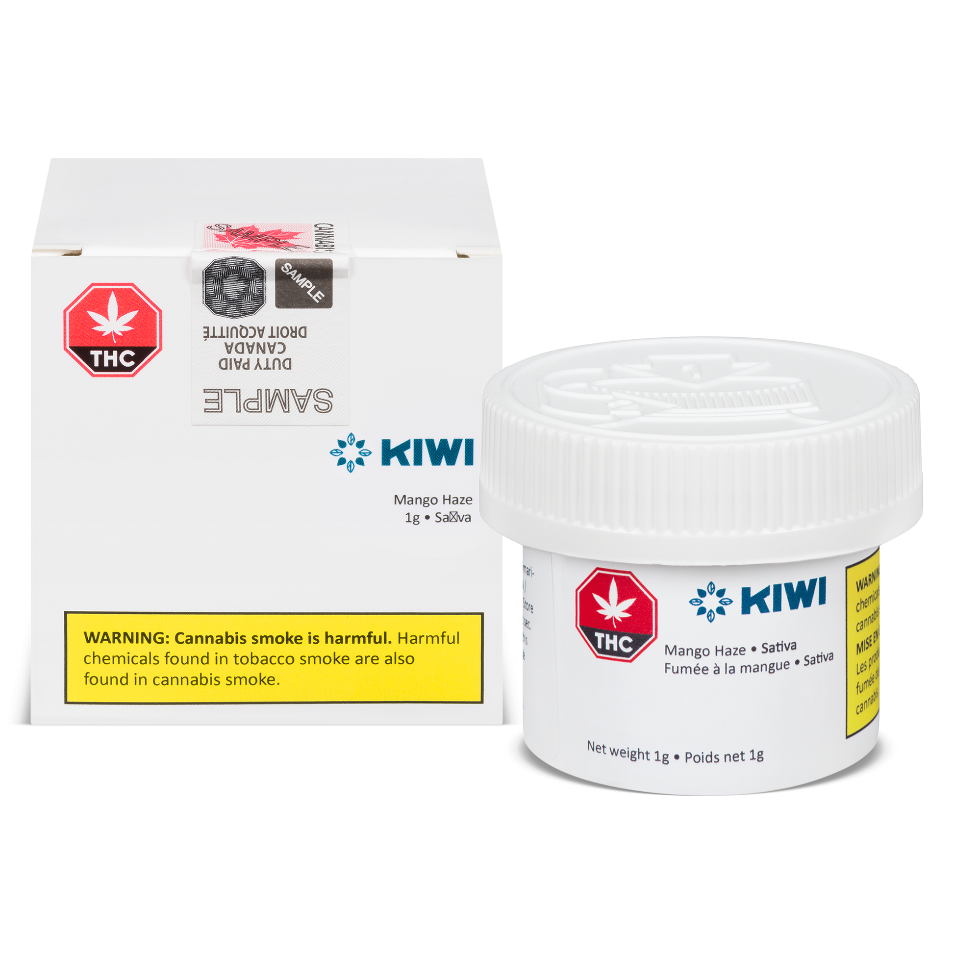 Mango Haze from Kiwi balances out its THC with CBD. It has mild THC potency and is grown, hand-trimmed and hand-sorted in a hybrid greenhouse. Its terpene profile is rich with beta-pinene and beta-caryophyllene, and it's available both pre-rolled and in a number of dried flower weights.