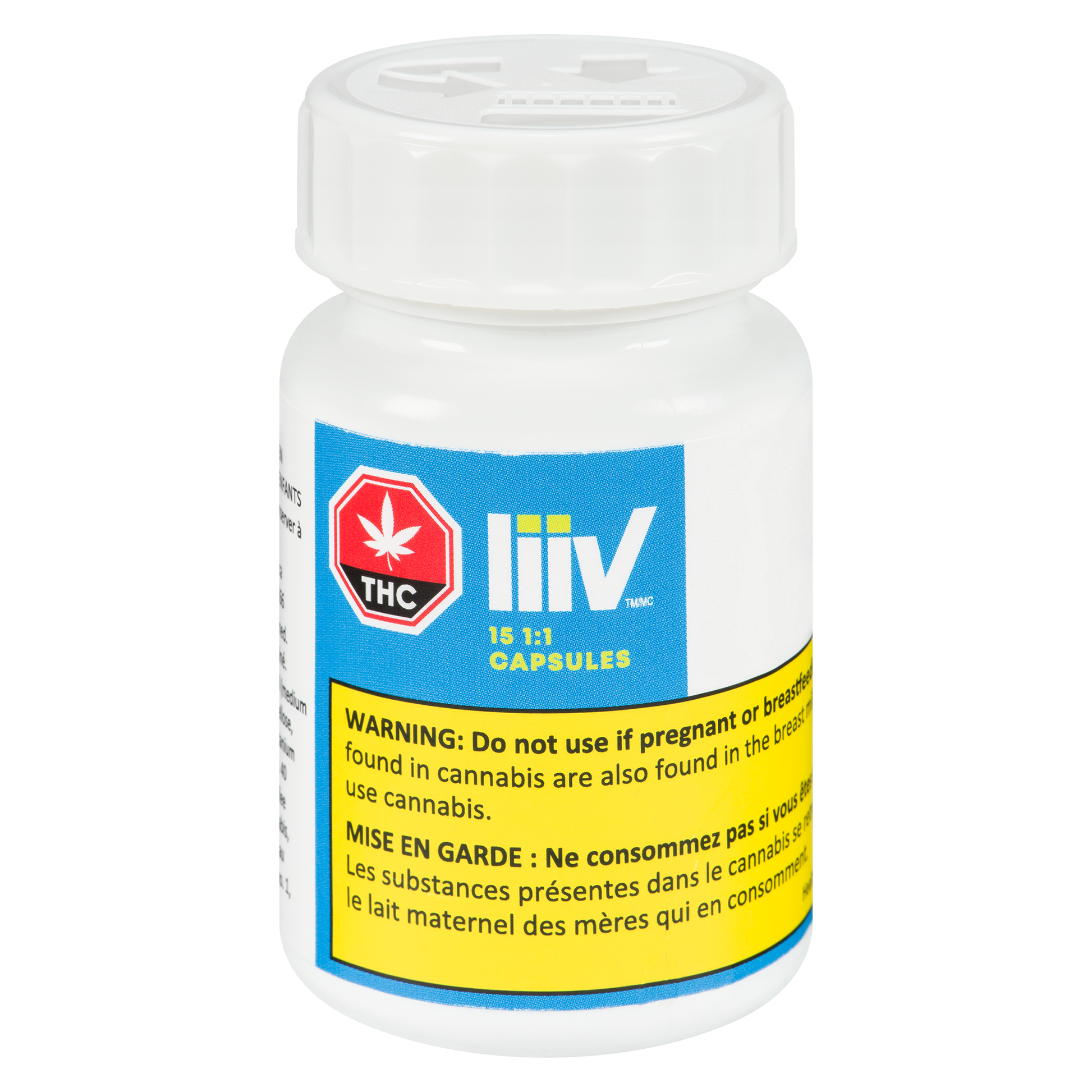 The oil in liiv's vegan cannabis oil capsules is extracted using CO2 extraction technology. The greenhouse-grown hybrid strain used in the oil has a myrcene, beta-caryophyllene, linalool, humulene and limonene terpene mix, and it's combined with grape seed oil and modified palm kernel oil to deliver a consistent 1 1 THC to CBD ratio. It's available in 15-capsule bottles and has very mild THC potency.
