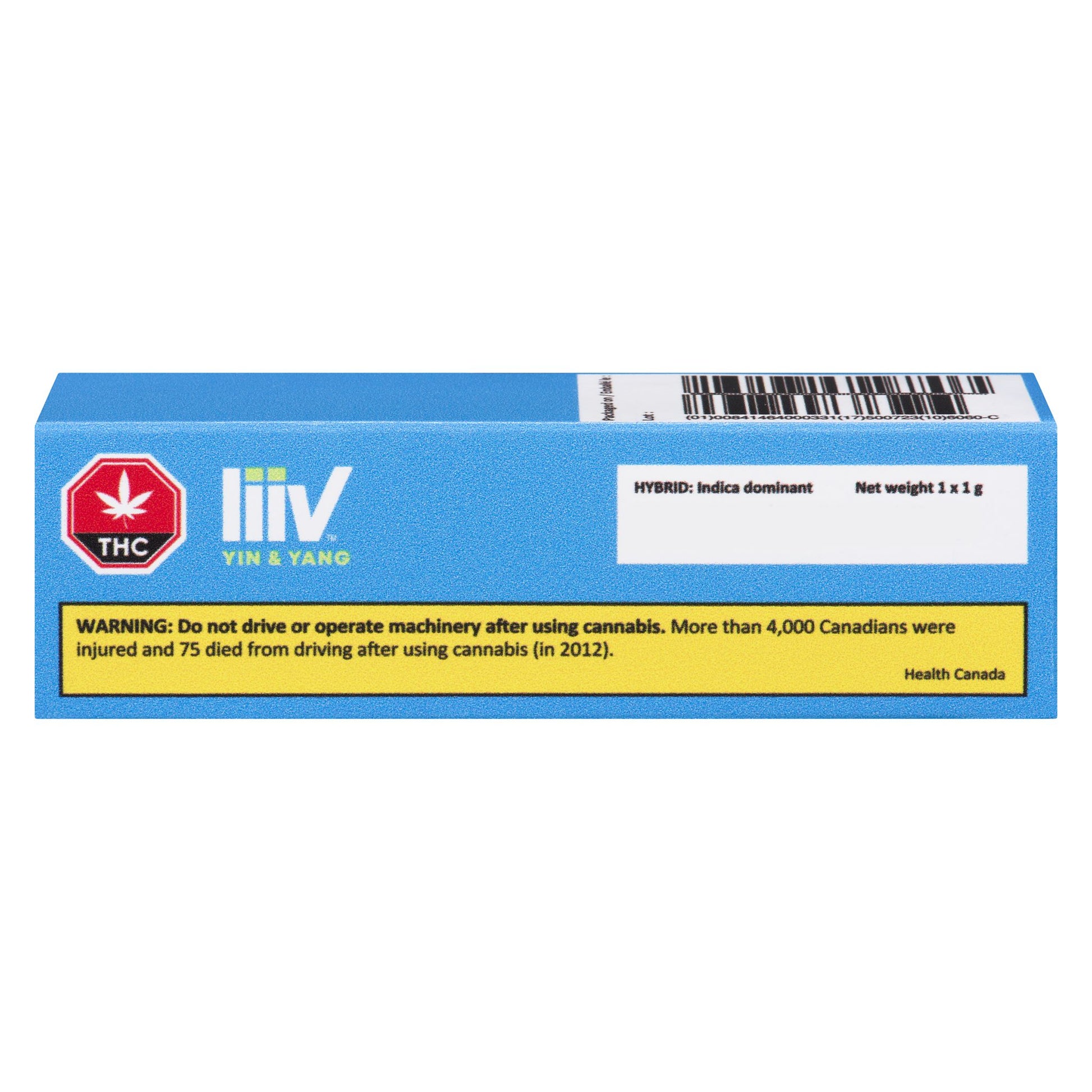 Yin & Yang from liiv is balanced strain offering a nearly 1 1 ratio of THC/CBD, which is greenhouse-grown and hand-sorted in the Niagara Escarpment. The hybrid strain with mild THC potency has a lemon flavour that comes from a terpene mix of alpha-pinene, beta-caryophyllene, limonene and linalool. Yin & Yang is available pre-rolled and in 3.5 g and 7 g dried flower sizes.