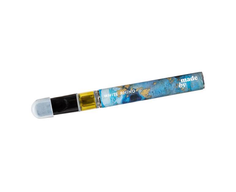 The Made By 0.22 g White Rhino is a ready-to-go vape pen featuring a high potency full-spectrum indica extract that uses whole flower instead of shake. Bursting with dominant tropical fruit flavours from the cannabis-derived terpenes, there are no artificial flavours here. This pen is great for chilling, dreaming, and your classic couch time. Only Made By vape pens feature artwork collaborations from Canadian artists, making it the most unique pen with the purest extract.