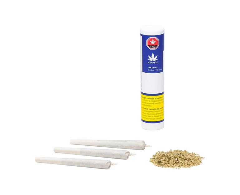 Namaste's buzz-worthy MK Ultra strain in pre-roll format is an indica strain that is high in THC. Its buds range from light to dark green with amber hairs accented throughout. This strain contains distinct sweet and fruity aromas, combined with earthy undertones. Recommended for experienced consumers. Made with 100% bud.