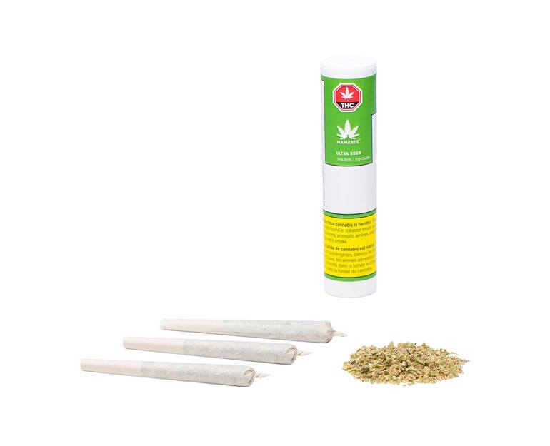 Namaste's Ultra Sour pre-rolls, made with 100% bud, deliver the sativa-dominant strain in an ultra convenient format. Made from pale green buds which glitter with trichomes and produce bold aromas of citrus and diesel. High THC, recommended for experienced consumers.