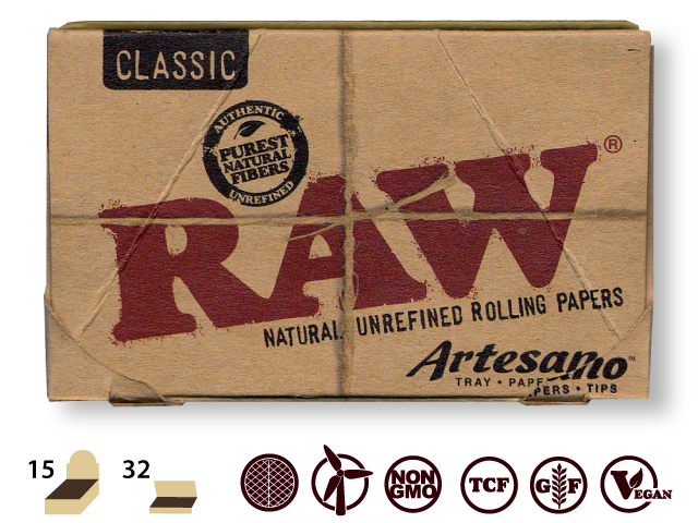 This product is final sale. RAW's Artesano pack contains 32 sheets of 1 1/4" rolling papers, 32 perforated tips and a pop-out spring-loaded paper rolling tray. The entire pack closes securely using a convenient paper-fold-over system and a single magnetic closure. Made from a hybrid blend of unbleached (not chlorine-whitened) hemp and flax fibres with no additives, the thin, vegan-friendly paper is a translucent natural light brown with an acacia gum line. Each paper features RAW's patented crisscross watermark that helps prevent runs and maintains the even-burning characteristics.