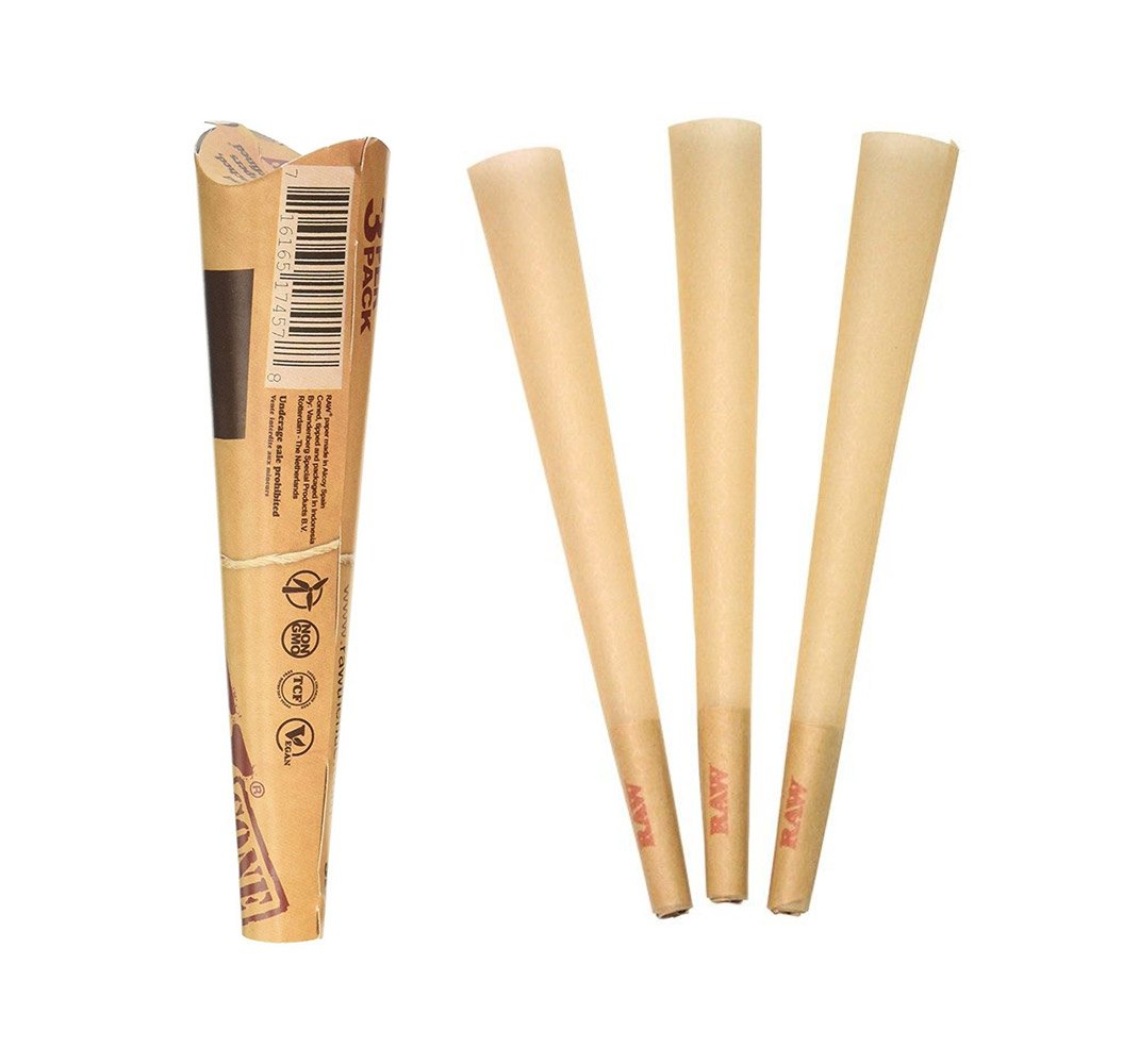 RAW Pre-Rolled Cones are made from hemp fiber papers with Hemp based gum. King Size. RAW are pure, less processed rolling papers unlike anything that you have ever seen or smoked. Because they contain a hybrid blend of unbleached (not chlorine whitened) fibers, the paper is a translucent natural light brown color. RAW is so thin that you can see through it. Each paper is watermarked with a patented CrissCross watermark. This special watermark helps prevent runs and maintains the smooth even-burning characteristics that we are famous for. RAW is available in many sizes and styles to suit the most discerning smoking connoisseur. Enjoy your favourite smoke in its purest RAW form. 3 cones per a pack!