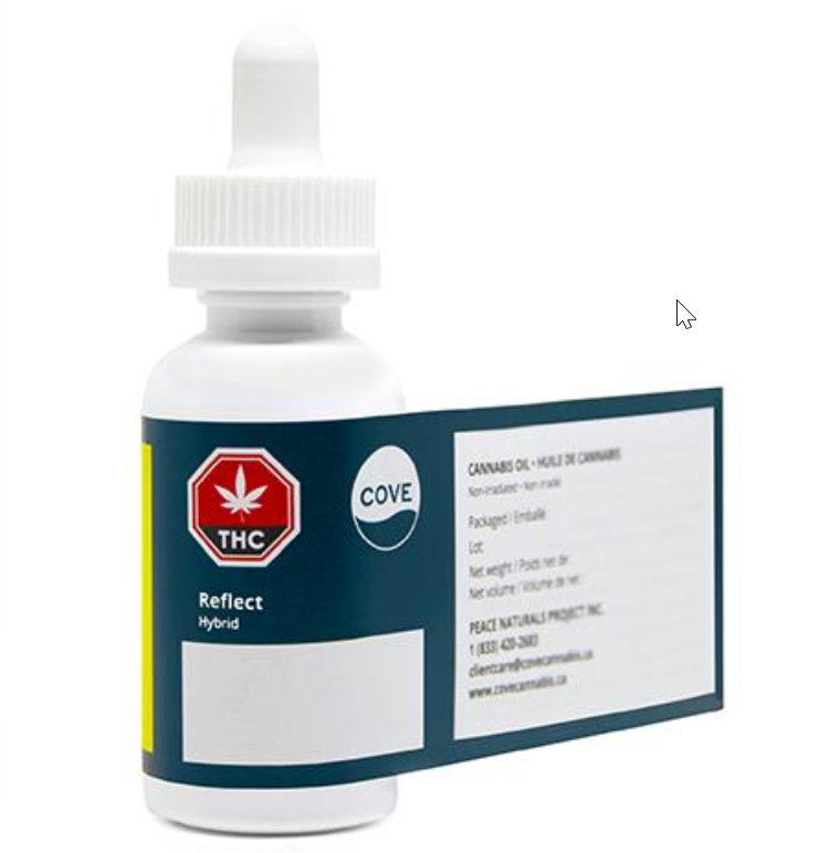 Reflect Oil by COVE is made from a proprietary, ethanol-free CO2 extraction method using an indoor-grown hybrid strain similar to OG Kush, which is blended with MCT oil. Its rich terpene profile includes myrcene, pinene, and caryophyllene. Reflect Oil is available in 20ml bottles and contains 26mg/ml of THC and 0mg/ml of CBD. This oil comes with a dropper that can hold up to 1 ml and is marked with increments of 0.1 ml.