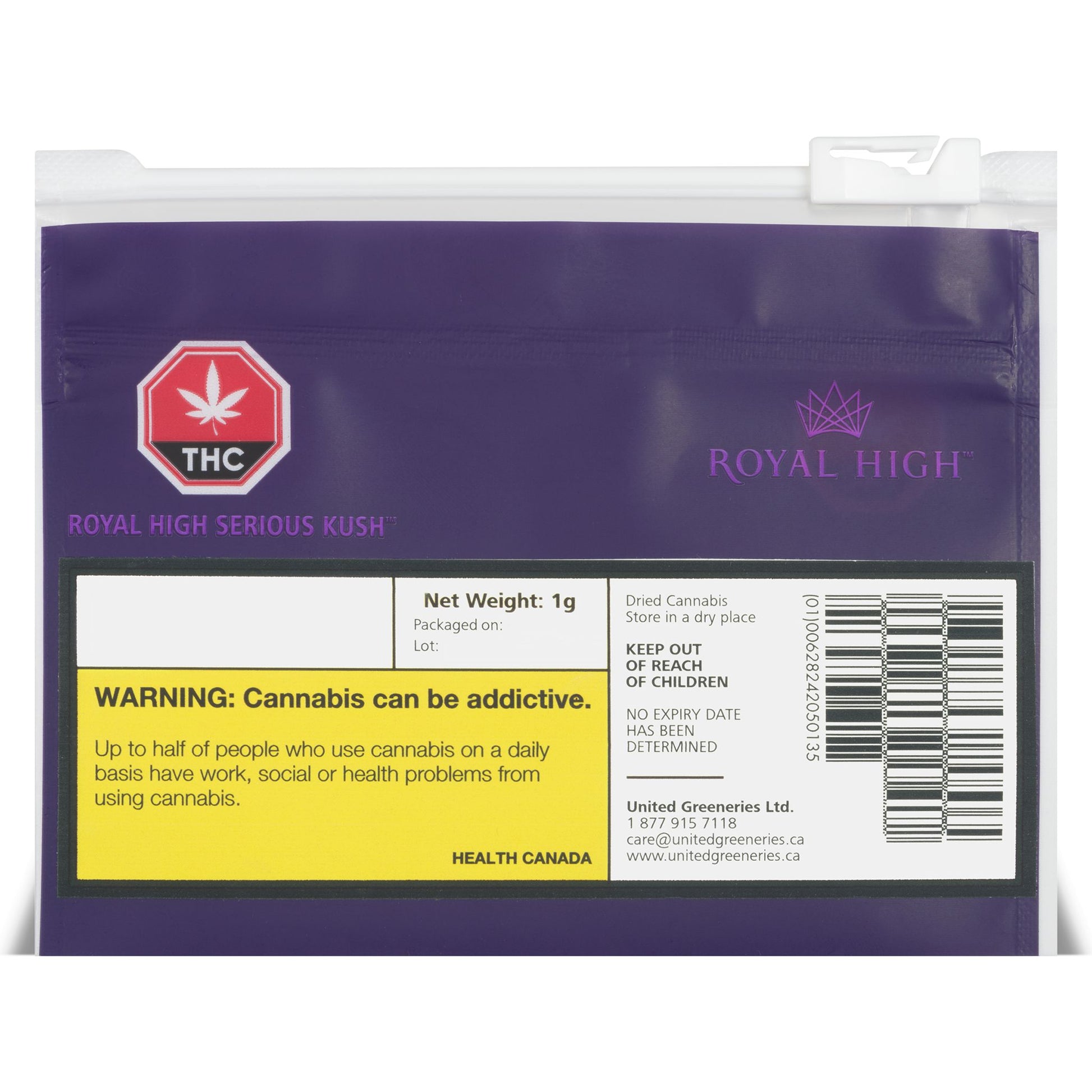 Serious Kush from Royal High is grown indoors on Vancouver Island with mother plants from imported seeds. This indica-dominant strain has medium THC potency, an earthy profile and a subtle, spicy finish. Its terpene mix includes alpha-pinene, beta-caryophyllene, humulene, limonene and myrcene, and it's available as dried flower in 1 g, 3.5 g and 7 g weights.