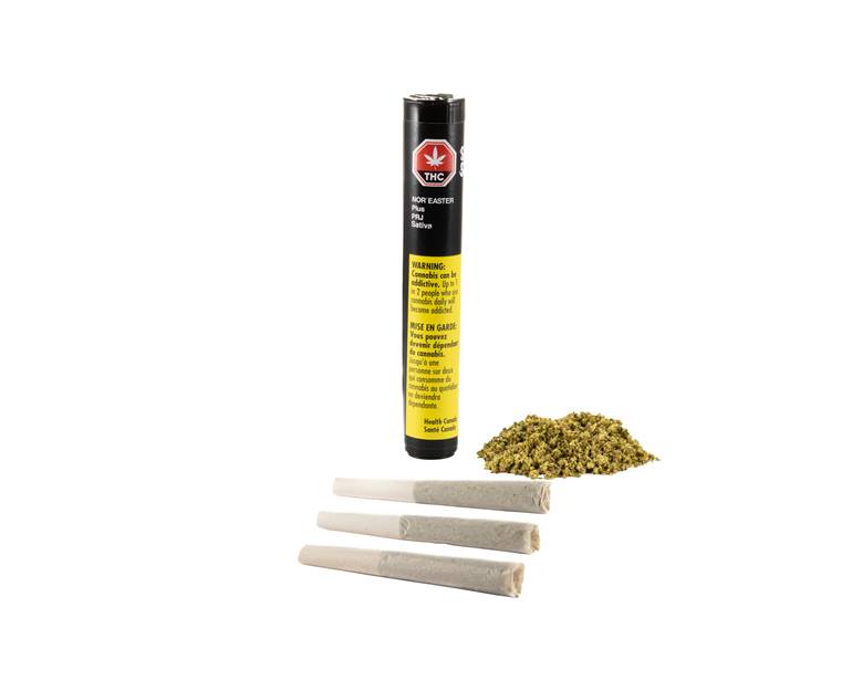 SKOSHA Nor'Easter Plus is sativa-dominant and high THC, offering pleasant aromas of citrus, pine and spice. Named with respect to the powerful storms on Canada's east coast, these pre-rolls are made with resinous whole flower, carefully milled and feature a folded tip. Nor'Easter Plus is available in pre-rolls and various dried flower sizes. This product, produced by SKOSHA, is milled whole flower, not shake, packaged in a recyclable tube and is non-irradiated.