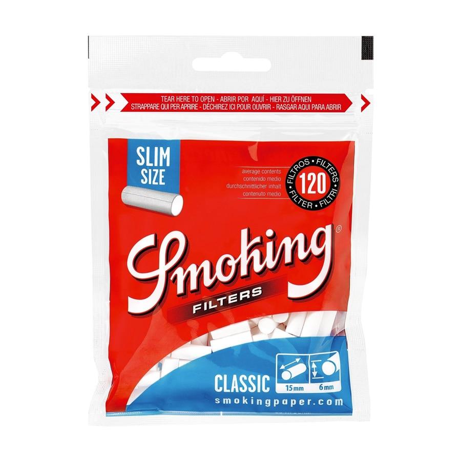 Classic Slim Paper Filters The Smoking classic slim filter tips are the perfect addition to any slim paper or pre-roll. These paper wrapped filter tips will help keep the mess out of your mouth as well as filter some of the harmful chemicals produced by smoking. Just place a filter tip and some flower in your favourite rolling paper and roll by hand or with one of our convenient rollers. Each bag contains 120 slim filter tips. Paper Filter Features Easy to use Perfect for Slim Papers 120 Filter Tips per Bag Resealable Plastic Bag Filter Length 15mm Filter Diameter 6mm