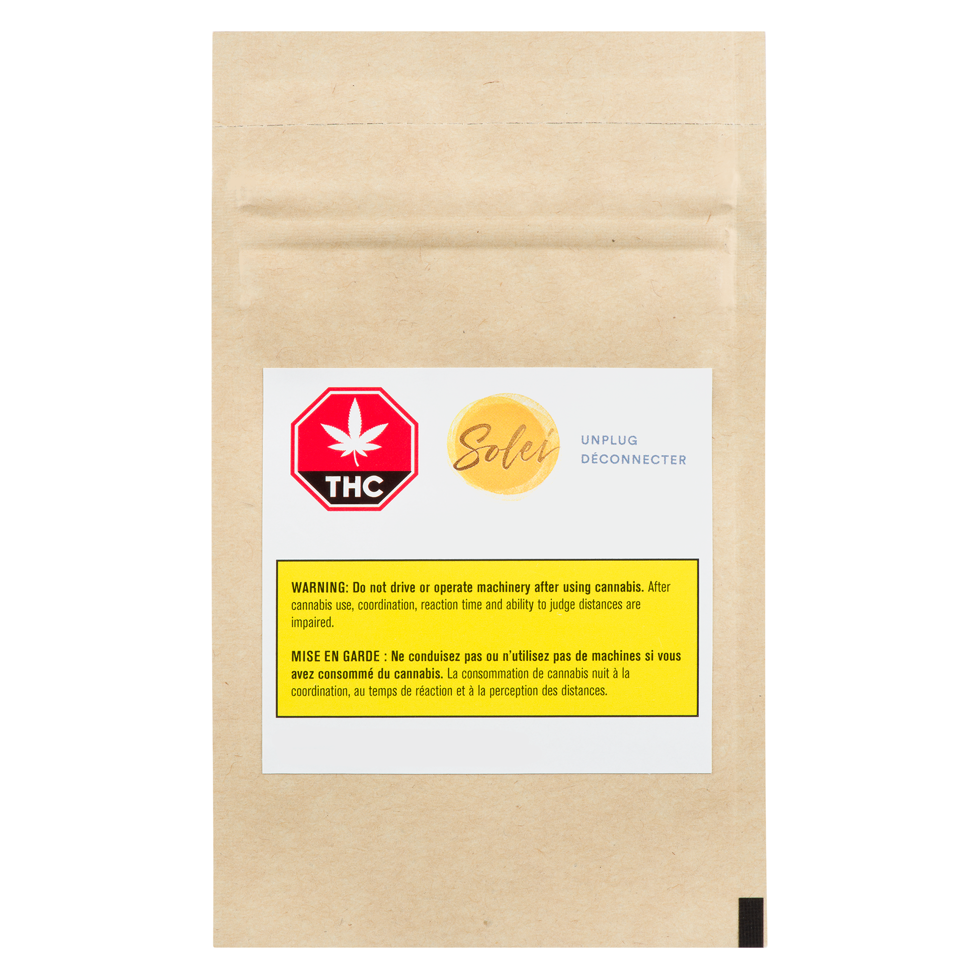 Solei Unplug from Aphria is sun-grown in an eco-friendly greenhouse. This strain with green hues has strong THC potency, and its aromatic berry notes are created by the myrcene in its terpene profile. It's available pre-rolled and in several dried flower weights.