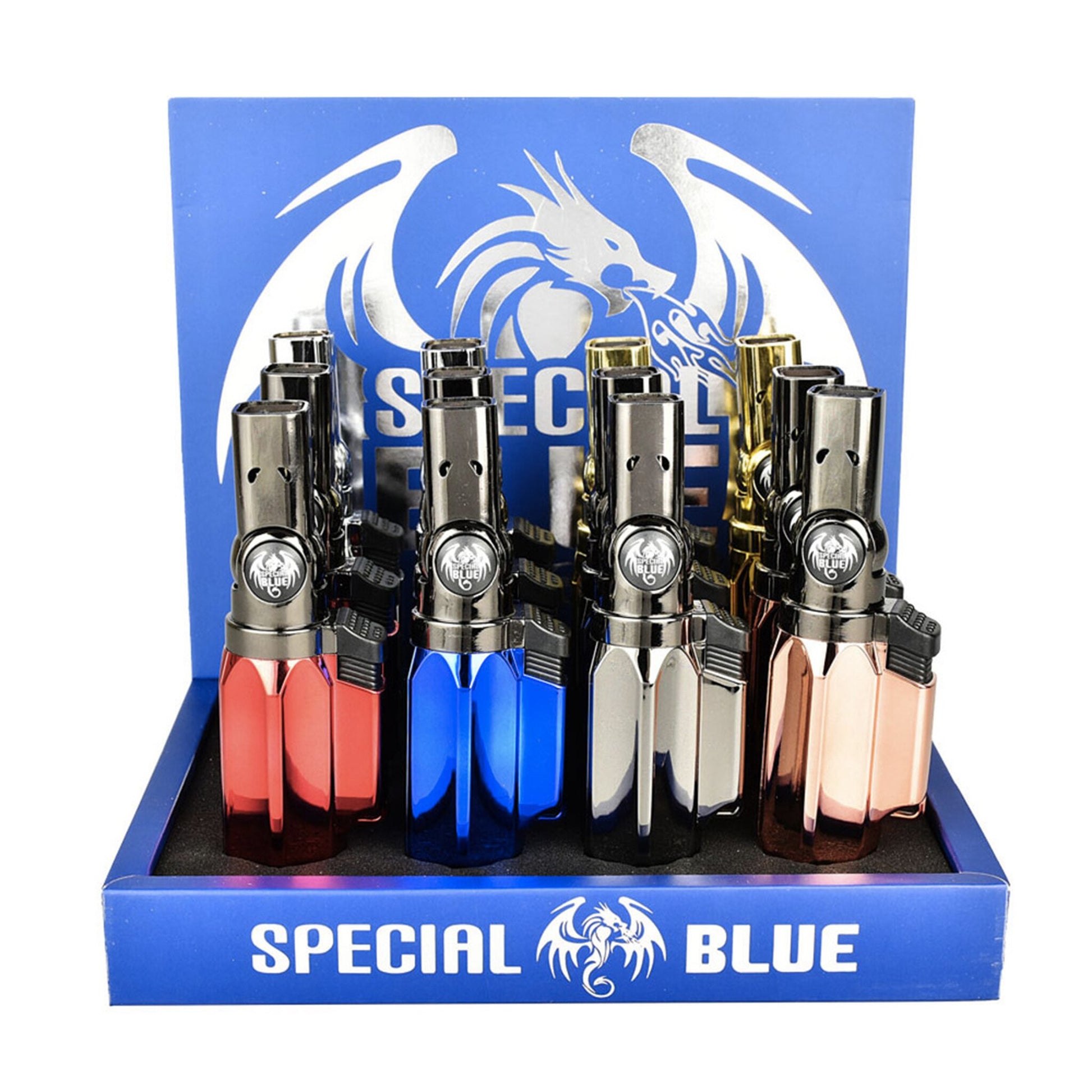 Refillable Butane Torches Special Blue "Laser" Torch Lighters are a multi-purpose butane torch that produces a high power quad flame and works at any angle. Special Blue Torches are great for lighting cigars, blunts, cannagars, pipes and campfires. These torches are pre-filled with butane and have assorted metallic finishes. The torch head swivels between 45 degrees and straight up.