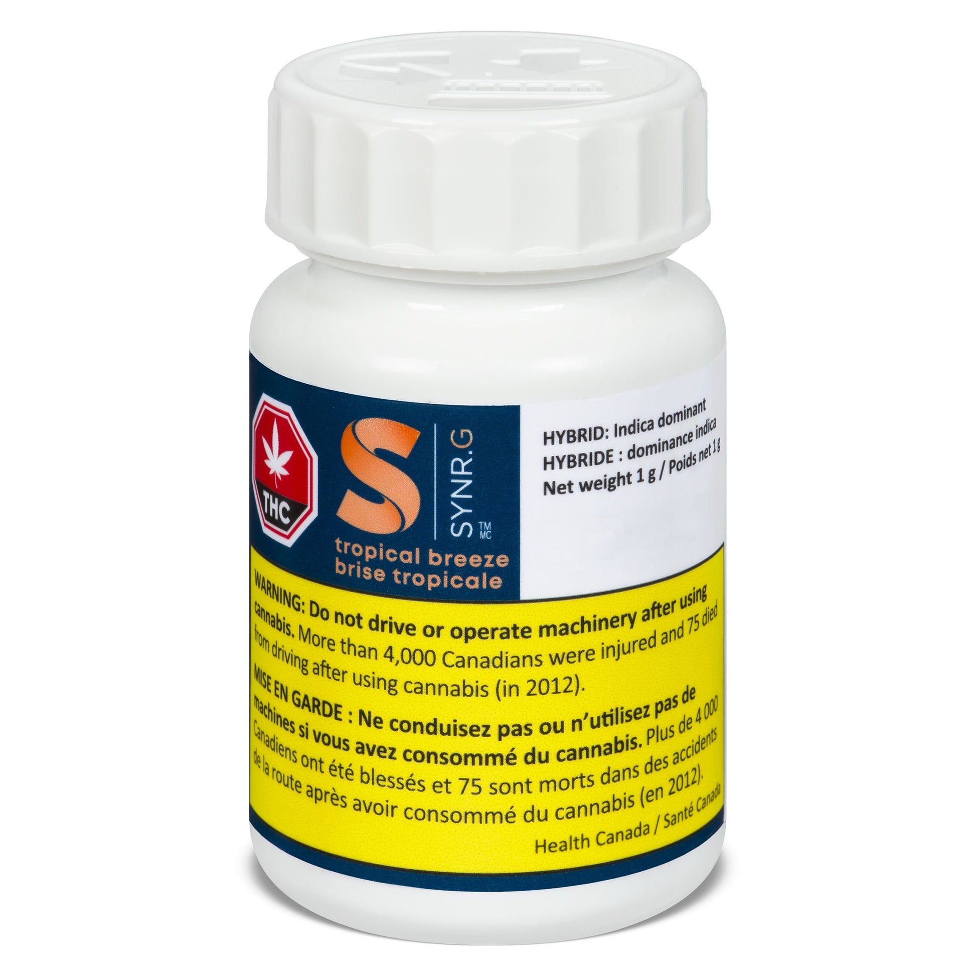 Tropical Breeze from Synr.g is grown and hand-sorted in the Niagara Escarpment. It has medium THC potency and features limonene, trans-caryophyllene, alpha- and beta-pinene, and humulene in its terpene mix, which give it its skunky, sour lime, tropical fruit taste. Tropical Breeze is available pre-rolled and in three dried flower sizes.