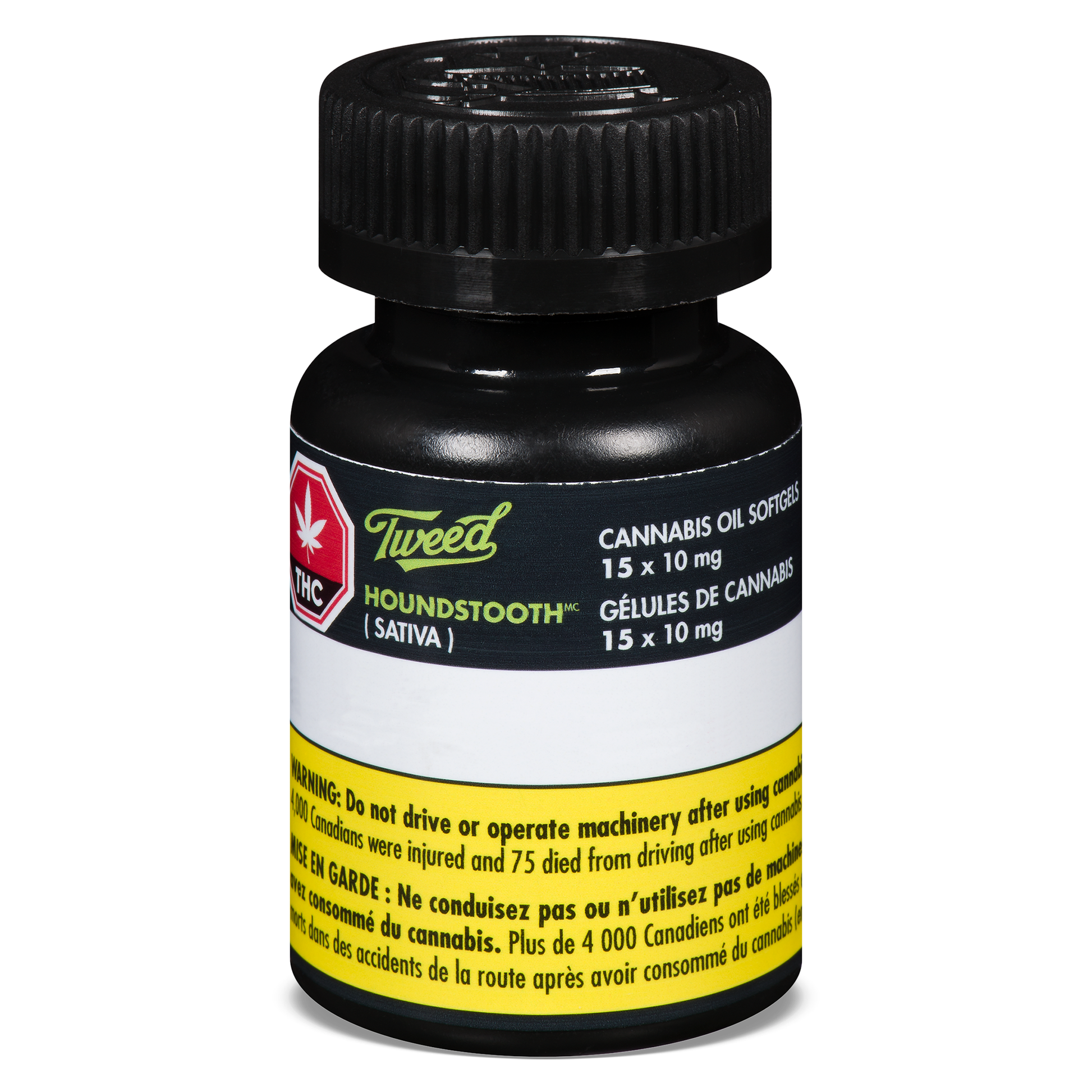 Greenhouse-grown Houndstooth from Tweed is a sativa-dominant strain with mild THC potency. Its buds have a purple hue and a complex aroma created by a terpene profile that includes myrcene (earthy), caryophyllene (clove-like), pinene (piney) and limonene (citrusy). It's available in various dried flower sizes, softgels and pre-rolls.