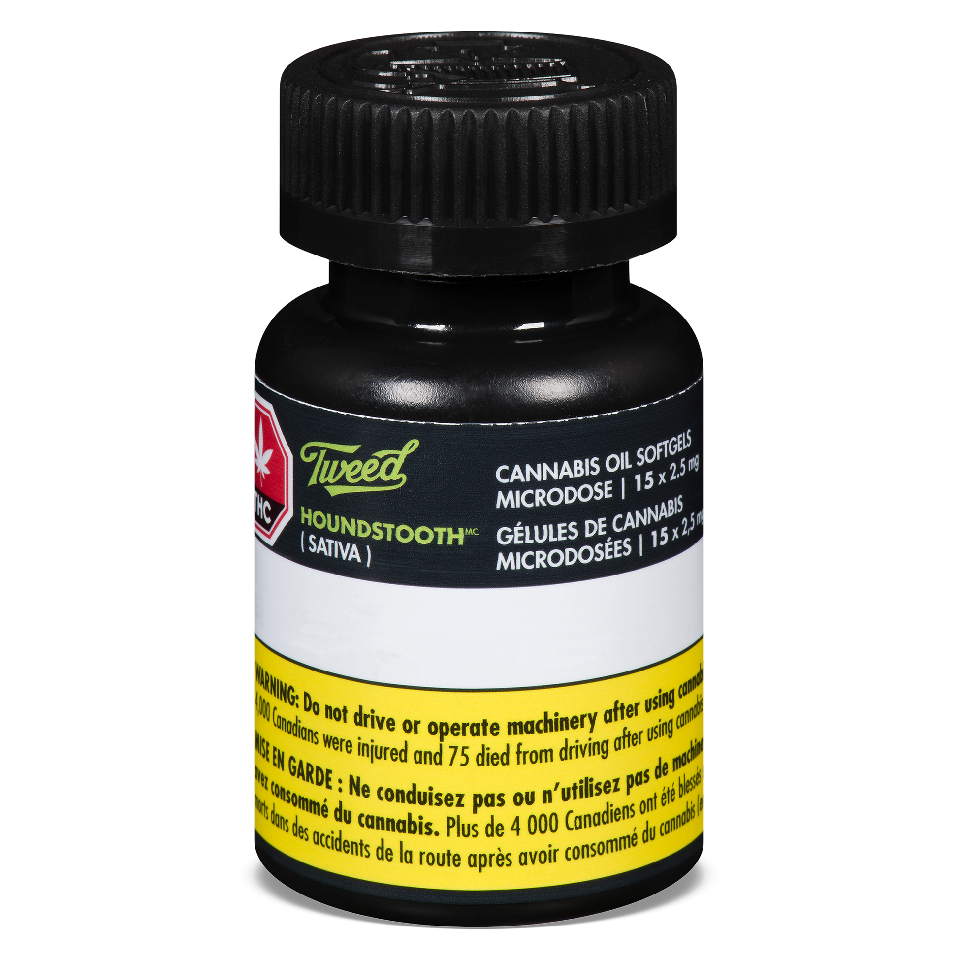 Greenhouse-grown Houndstooth from Tweed is a sativa-dominant strain with mild THC potency. Its buds have a purple hue and a complex aroma created by a terpene profile that includes myrcene (earthy), caryophyllene (clove-like), pinene (piney) and limonene (citrusy). It's available in various dried flower sizes, softgels and pre-rolls.