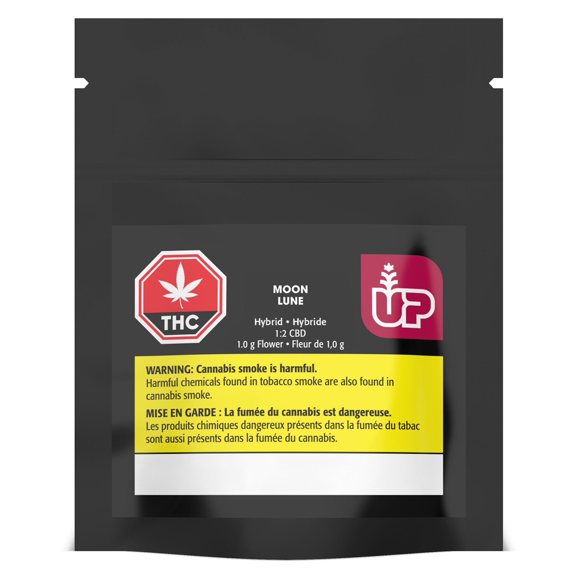 Grown in Up's Great Emerald Hall greenhouse in Niagara, Moon is a well balanced, highly fragrant hybrid strain with mild THC and high CBD content. Moon's terpene profile, highlighted by Eucalyptol (found in eucalyptus), Cymene (cumin and thyme) and Alpha-Pinene (pine trees) gives this strain an herbal, musky taste and a tropical, earthy smell. Its resin-coated buds have bright orange hairs and an abundance of white crystal trichomes. Moon is available as 1 g and 3.5 g of dried flower.
