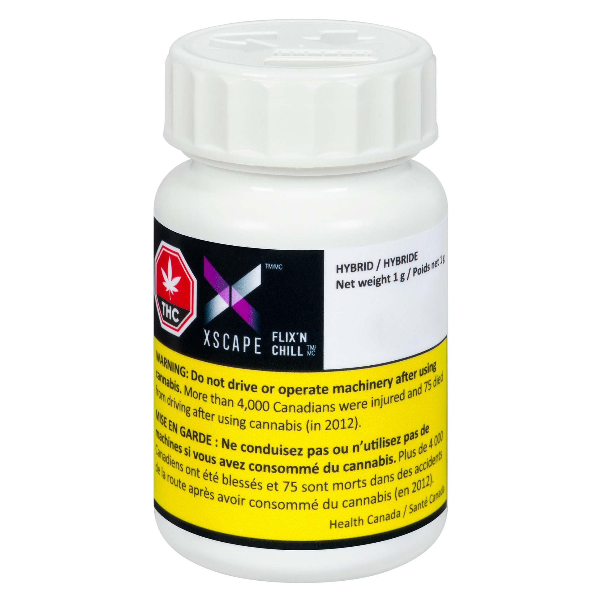 Flix n Chill from Xscape is grown and hand-sorted in a greenhouse in the Niagara Escarpment. The hybrid strain has very strong THC potency and an earthy, musky taste created by the beta-caryophyllene, myrcene, limonene, and alpha- and beta-pinene in its terpene mix. Flix n Chill is available pre-rolled and in three dried flower sizes.