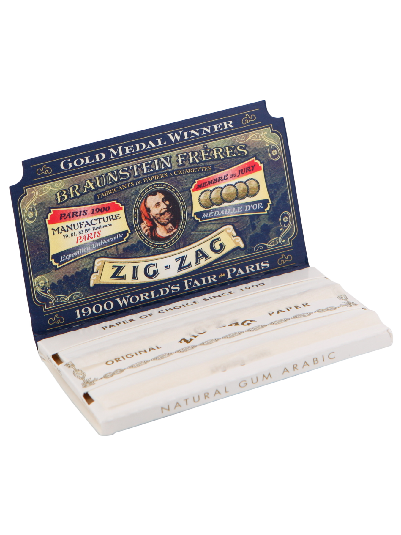 The original Zig-Zag paper comes in the iconic white booklet. A single wide paper, the “white” is a classic even burning paper. -70mm x 38mm -Made using Natural Flax Plant Fibers -100% Natural Gum Arabic